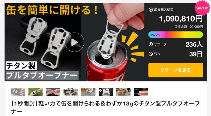 さらに注目すべきは、そのデザイン性と携帯性です。キーホルダーのように持ち歩けるコンパクトさで、アウトドアや旅行先でも活躍。シンプルな機能でありながら、素材の質感や手に取ったときの軽快さが「所有する喜び」につながっています。230名もの支援者数は、単なる便利グッズにとどまらず「ちょっとした日常の不満を解決してくれる仲間」としての共感を呼んだ結果といえるでしょう。達成金額は決して突出していませんが、それ以上に多くの人の心をつかんだこのプロジェクトは、小さなアイデアが大きな支持を集める好例です。