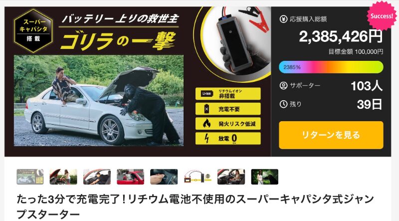 車のバッテリーが突然上がってしまったとき、頼りになるのがジャンプスターター。しかし従来製品はリチウム電池を内蔵しており、重く、充電時間が長いという欠点がありました。「ゴリラの一撃」はその常識を覆し、スーパーキャパシタを採用することで、わずか3分でフル充電できる画期的な製品です。非常時にすぐ使えるだけでなく、リチウム電池を使わないことで安全性が高く、長寿命なのも魅力。目標金額10万円に対し、すでに230万円を突破しており、100名以上の支援者が集まる結果となっています。数字は決して派手ではありませんが、「車を持つ人なら誰もが共感する便利さ」が支持の背景にあるといえるでしょう。