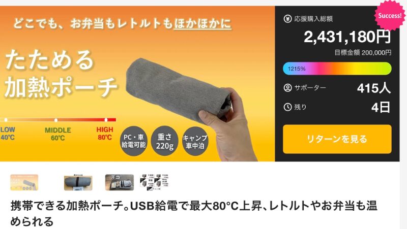 240万円以上の支援を集めた背景には、実用性と現実的なサイズ感がある。大げさな装置ではなく、持ち運べることを前提とした設計は、仕事中のランチや車内、アウトドアなど多様なシーンに対応する。食事の満足度は温度で大きく変わる。このシンプルな事実に向き合い、確実に応える道具として、日常の選択肢を広げてくれる存在だ。