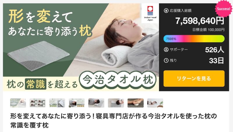 目標金額10万円に対して達成金額750万円以上、支援者520人を集めている「NERUSIA今治タオル枕」は、寝具専門店 ビーナスベッドによるプロジェクトだ。形状を自由に調整できる設計と、今治タオル素材を使用したやさしい肌触りが特徴で、一人ひとりの頭や首の形に合わせてフィットする点が大きな魅力となっている。固定された形に依存しない構造により、自分好みの高さや形状を細かく調整できるため、よりパーソナルな寝心地を実現している。