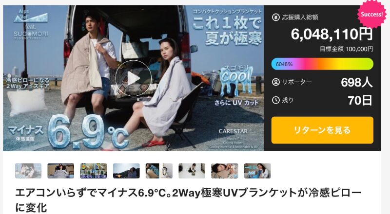 目標金額10万円に対して達成金額600万円以上、支援者690人を集めている「SUGOMORIクールブランケット」は、CARESTARによるプロジェクトだ。最大マイナス6.9℃の冷感を実現する素材を採用し、ブランケットとしてだけでなく冷感ピローとしても使える2Way仕様が特徴となっている。暑さによる不快感を軽減し、エアコンに頼りすぎない快適な環境づくりをサポートするアイテムとして注目されている。