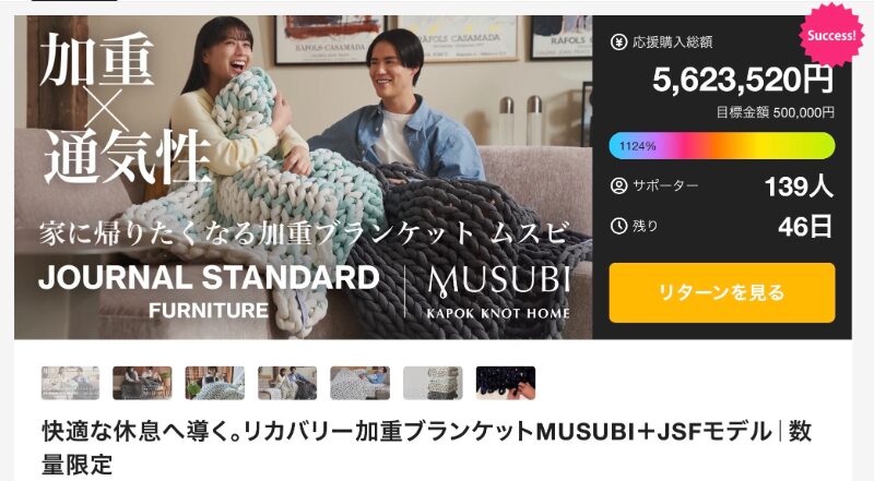 目標金額50万円に対して達成金額560万円、支援者130人を集めている「MUSUBI+JSFモデル 加重ブランケット」は、深井喜翔によるプロジェクトだ。適度な重みで身体を包み込む設計が特徴で、安心感のある使用感によってリラックスした状態へと導くことを目指している。数量限定モデルとして展開されており、デザイン性と機能性を兼ね備えた点も注目されている。