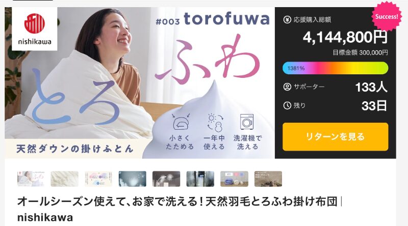 また、西川が誇る独自の「トリプルエア構造」は、睡眠中の湿度を自動的に調整。寝汗をしっかり逃がしながら、心地よい温度をキープします。羽毛の質にも徹底してこだわり、国内で丁寧に洗浄・精製された高品質ダウンのみを使用。長時間使っても羽毛特有の匂いが気にならず、肌に触れる瞬間から違いがわかります。目標金額30万円に対し、すでに410万円以上を達成。多くの支援者がその品質と軽やかさに魅了されています。古き良き職人技と、現代的な暮らしのニーズを融合させた究極の羽毛ふとんです。。