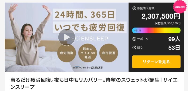 肌触りはしっとりと柔らかく、ストレッチ性にも優れているため、一日中着ていてもストレスを感じません。独自の「デュアルニット構造」により、内側は保温、外側は通気をコントロール。暑すぎず寒すぎず、ちょうど良い温もりが続きます。目標金額50万円を大きく上回る230万円以上を達成し、すでに多くのユーザーがその快適さを体感。睡眠だけでなく、昼間の疲労軽減にも役立つ“24時間リカバリー”を叶える1着です。