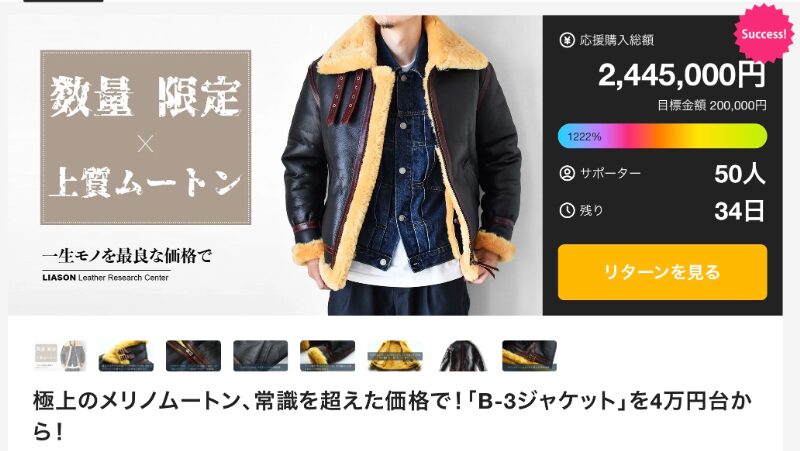 高級アパレルの世界で名高い「メリノムートン」。一般的には10万円〜30万円以上が当たり前の希少素材ですが、LIASONはその常識を覆しました。「極上のメリノムートン B-3ジャケット」を、なんと4万円台から提供。目標金額20万円に対し、すでに240万円超を達成し、支援者50名以上がその価値を認めています。このプロジェクトが注目される理由は、“品質の高さ”と“価格のギャップ”にあります。素材自体が自然の断熱材のように暖かく、しっとりとした肌触りは、冬の冷たい空気を忘れてしまうほど。そのうえ、無駄な装飾を省き、シルエットを洗練させることで、大人の冬アウターとしての魅力を最大限に引き出しています。
