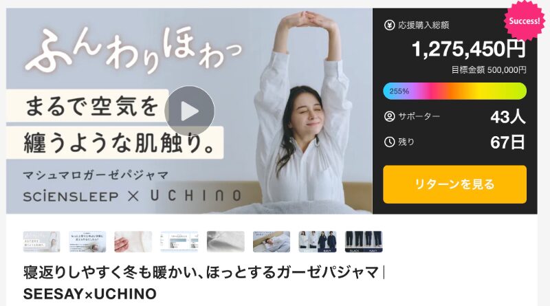 寝返りがしやすく、冬でもふんわり暖かい。「サイエンススリープ ガーゼパジャマ」は、その名の通り、眠りの質を科学的に追求したパジャマです。UCHINOのガーゼ技術とSEESAYの設計力が融合し、「冬のパジャマ=重い・動きにくい」という固定概念を覆しました。目標50万円に対して120万円を突破し、40名以上がすでにその良さを実感。着心地の秘密は、何層にも重ねられたガーゼによる“軽さ”と“保温性”の絶妙なバランスにあります。空気をふくむガーゼはふんわりとしたぬくもりを保ちながら、汗や湿気を素早く逃がすため蒸れにくく、冬の寝苦しさを防いでくれます。