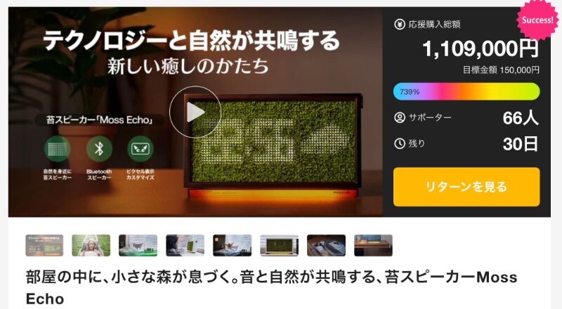 KICKSGOGO が届ける「Moss Echo」は、苔そのものをデザインに取り込んだまったく新しいスピーカー。達成金額110万円、支援者60人を集め、自然と音の融合という独自性が高く評価されています。最大の魅力は、自然素材の苔が生み出す静けさと音の共鳴。スピーカーの振動が苔に伝わることで柔らかい音の広がりが生まれ、普通のスピーカーでは得られない“深い呼吸のような音質”が体験できます。見た目にも癒し効果があり、部屋に置いておくだけで小さな自然が宿るような存在感。忙しい日常の中、ふと目に入るたびに気持ちが整うような、ミニマルでありながら感性を刺激するインテリアアイテムとしても優秀です。