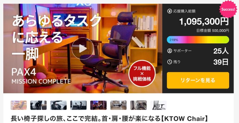 体重がかかるポイントが分散され、長時間座っても疲れにくい設計になっています。“長い椅子探しの旅がようやく終わる”というキャッチコピーに納得できる、完成度の高いチェアです。現代は一日に何時間も椅子に座る人が多く、「座り心地の良さ=生活の質」を左右するほど重要。KTOW Chair は、作業効率の向上だけでなく、肩こりや腰痛の予防にも繋がる実用性の高さが魅力です。インテリアとしても落ち着いたデザインで、どんな環境にも馴染む汎用性があり、自宅・オフィスともに使いやすい仕上がり。椅子選びで妥協したくない人に向けた、確かな答えを示すプロジェクトです。