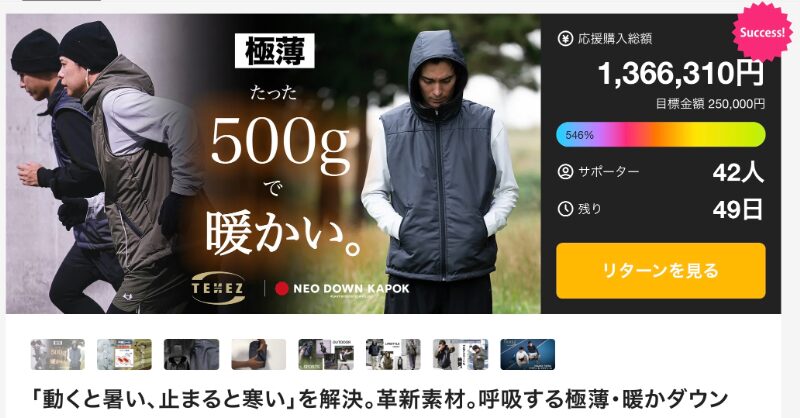 冬のアクティビティで多くの人が感じるのが、「動くと暑く、止まると寒い」という温度変化のストレス。TENEZが開発した「呼吸するダウンベスト」は、その悩みを科学的に解決しました。目標金額25万円に対し、すでに130万円を突破。支援者数は40名ながら、リピーターを中心に注目を集めています。軽量・撥水・透湿性を兼ね備えたこのベストは、“着た瞬間から心地よい”を体現する革新素材です。