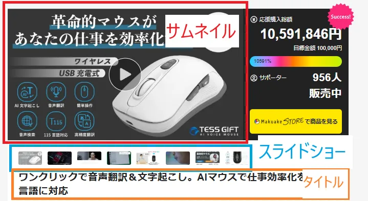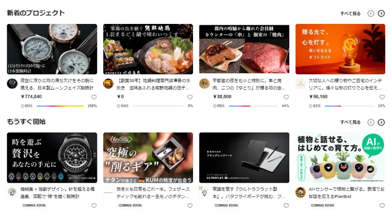 支援者がプロジェクトを知るきっかけの多くは、クラファンサイト上の一覧ページや、SNSでシェアされた投稿です。そのとき最初に目に入るのが、タイトルとサムネイル画像(メイン画像)であり、Makuakeだと以下のような魅力的な画像が並んでいます。