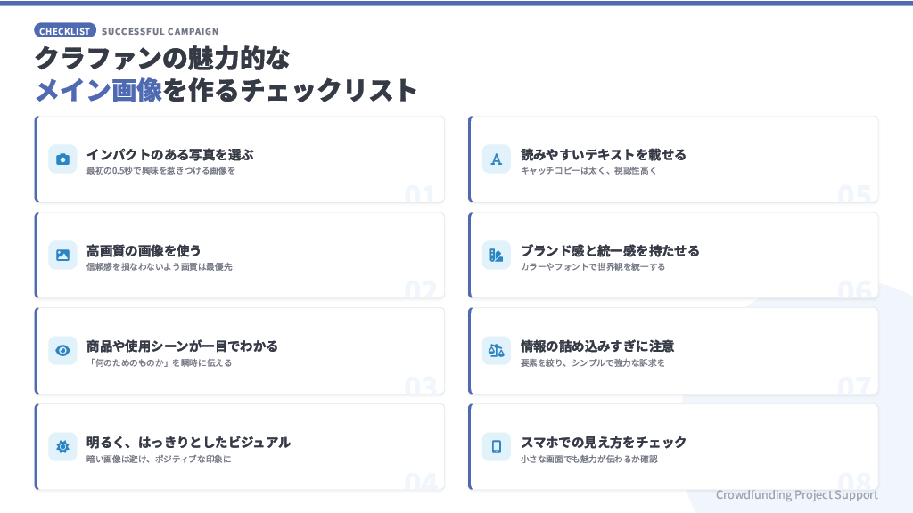 メイン画像やサムネイルでプロジェクトへの関心を引き、本文内の画像や図解で商品の魅力を分かりやすく伝え、GIFや動画で使用感や変化を直感的に見せる。これらを適切に組み合わせることで、支援率は大きく向上します。