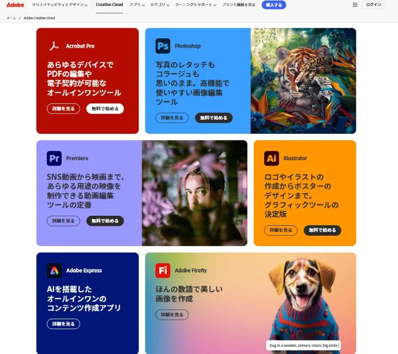 Adobe Creative Cloudは、Adobeのデザイン・写真・動画編集など20以上のアプリを月額制でまとめて使えるサブスクサービスです。 ファイル共有やクラウドストレージ、フォントなどのオンラインサービスも一緒に利用でき、デザイン・映像制作業界の標準ツール群です。