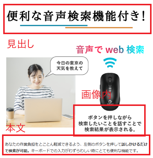画像の中に文字を入れる場合(メイン画像のキャッチコピーや、図解中のラベルなど)、画像内フォントや色もページ全体の文字と調和させてください。