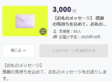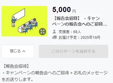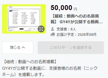 クラウドファンディングの魅力といえば、そこでしか入手できない特別なリターンです。GY4Y・YouTube開設プロジェクトにおいても、限定性のあるリターンが用意されていました。