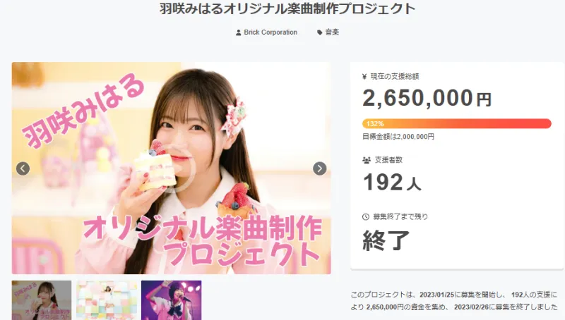 今回の挑戦は羽咲さん本人の活動実績に加え、オリジナル楽曲制作というテーマ、そしてファン参加型のリターン設計が支持を集めた結果といえるでしょう。