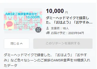 参照:羽咲みはるオリジナル楽曲制作プロジェクト(CAMPFIRE) - ASMR音声/中価格リターン