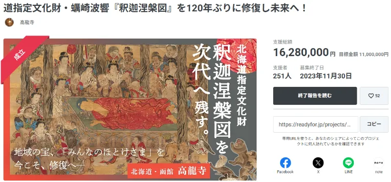 北海道函館市の高龍寺が実施した重要文化財「釈迦涅槃図」の修復プロジェクトは、わずか2ヶ月で1,634名の支援者を集め、目標の1,100万円を超える約1,628万円の支援を獲得しました。