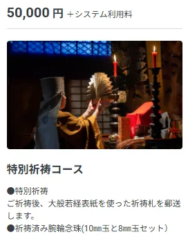 ご祈祷後、大般若経の表紙を使った祈祷札を郵送。宗教的な価値を求める層に響く内容です。