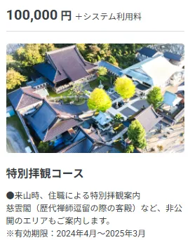 住職による個別案内で、通常非公開の慈雲閣(歴代禅師逗留の際の客殿)も見学可能。体験に価値を感じる支援者向けの設計です。