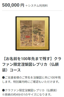 支援者の芳名が涅槃図と共に100年残り、特別案内時に確認できます。高額ですが、歴史に名を刻むという特別な価値を提供しています。