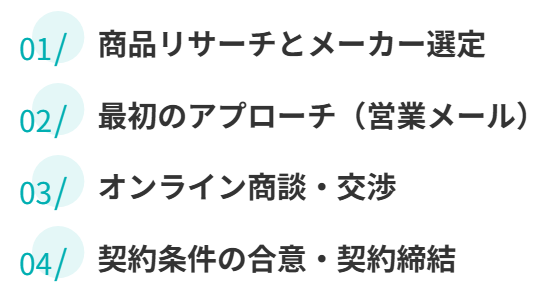 海外メーカーとの交渉は、国内市場のリサーチから始まり、営業メール、商談、契約締結へと進んでいきます。