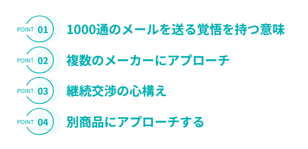 特に初心者の方は、最初の営業段階でつまずくこともあるでしょう。しかし、本記事で紹介したテンプレートを参考に、まずは1,000件のメーカーにメール営業をかけてみてください。