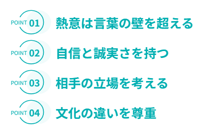 初めて英語商談に挑む方の中には、このような疑問を持つ人が多くいます。しかし実際には、ビジネス交渉で最も大事なのは英語力そのものではなく熱意や伝える姿勢であり、完璧な文法で話せなくても問題ありません。
