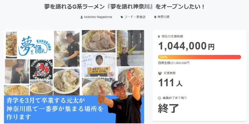 神奈川県・東海大学前にオープンしたG系ラーメン店「夢を語れ神奈川」が、CAMPFIREで100万円以上の支援を集め、見事開業を果たした事例をご存じでしょうか。
