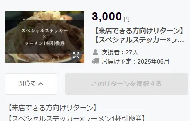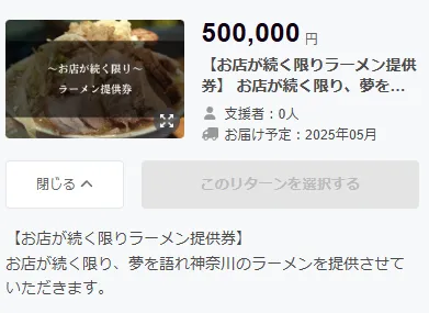 参照:夢を語れるG系ラーメン『夢を語れ神奈川』をオープンしたい!(CAMPFIRE) - 永続ラーメン券