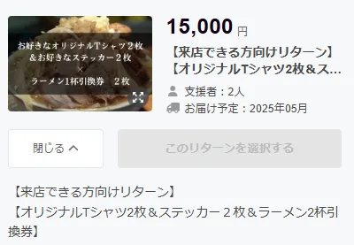 参照:夢を語れるG系ラーメン『夢を語れ神奈川』をオープンしたい!(CAMPFIRE) - ラーメン券+オリジナルTシャツ/中価格リターン