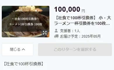 参照:夢を語れるG系ラーメン『夢を語れ神奈川』をオープンしたい!(CAMPFIRE) - 社食・ラーメン100杯券/高価格リターン