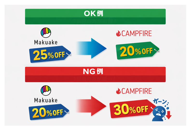 NG例: Makuakeで20%OFF → CAMPFIREで30%OFF(1回目の方が損)