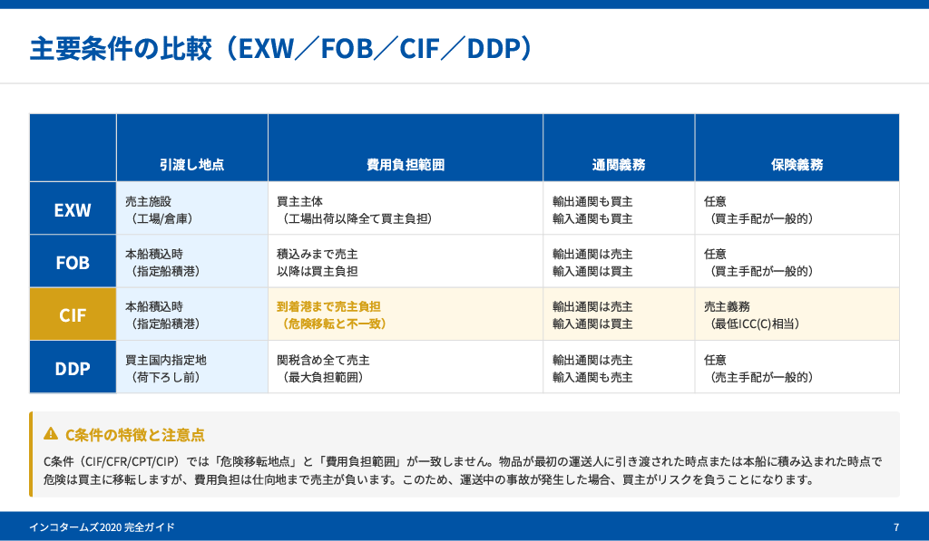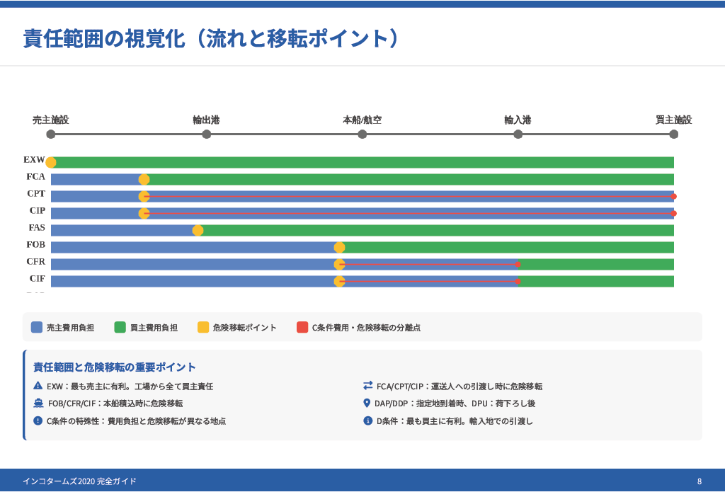 各インコタームズにおける買い手・売り手の責任を視覚的にまとめました。
